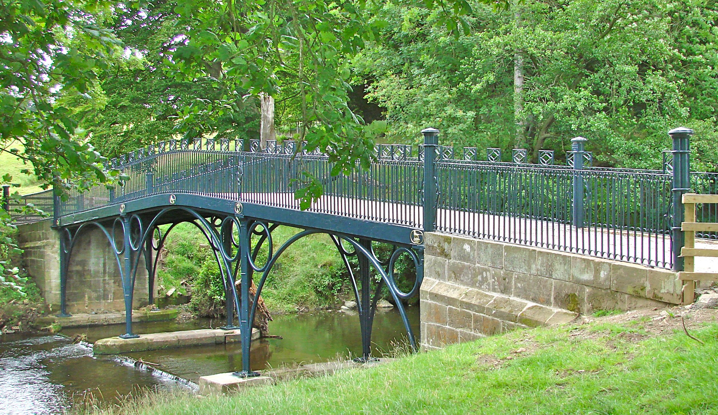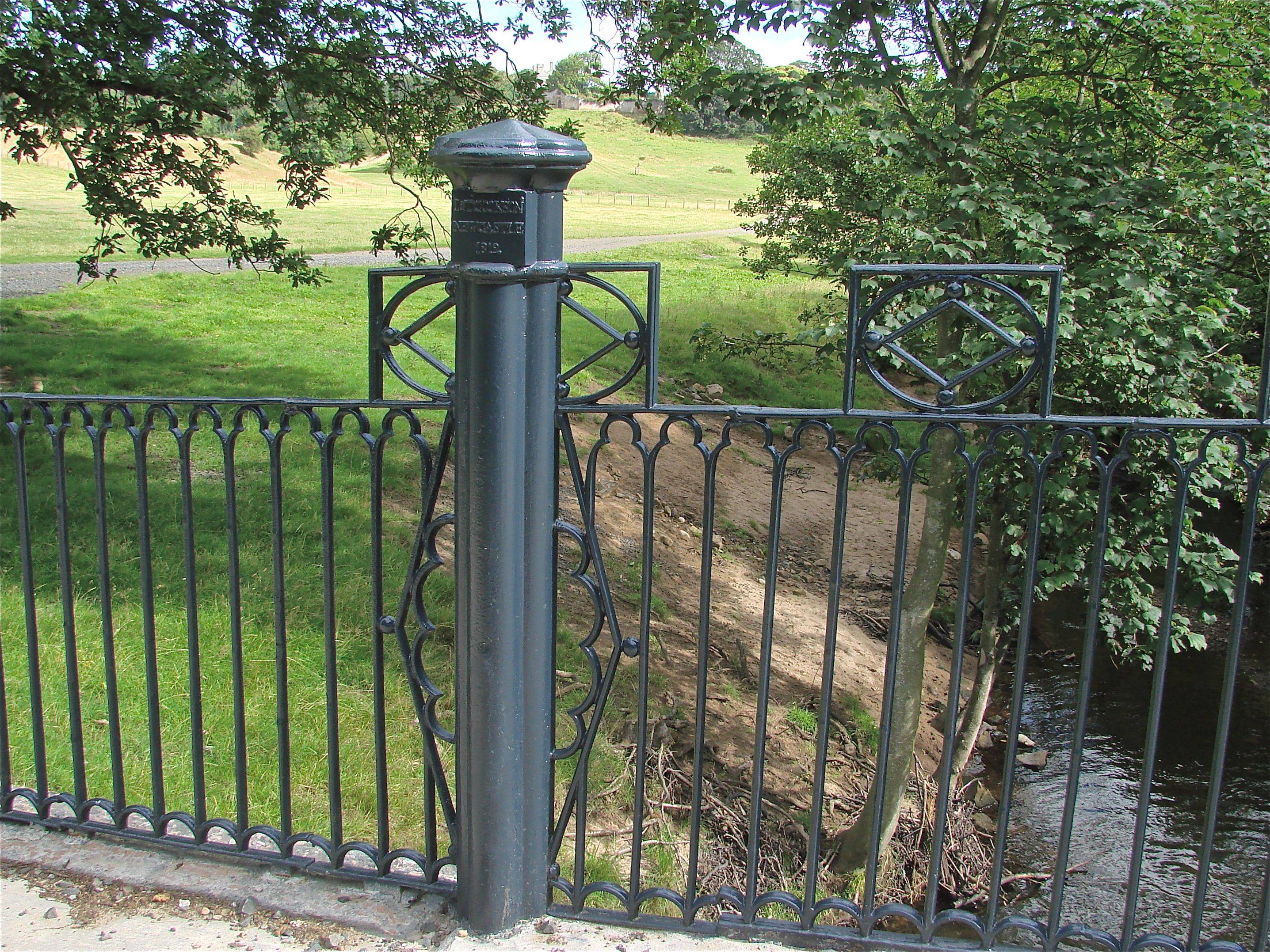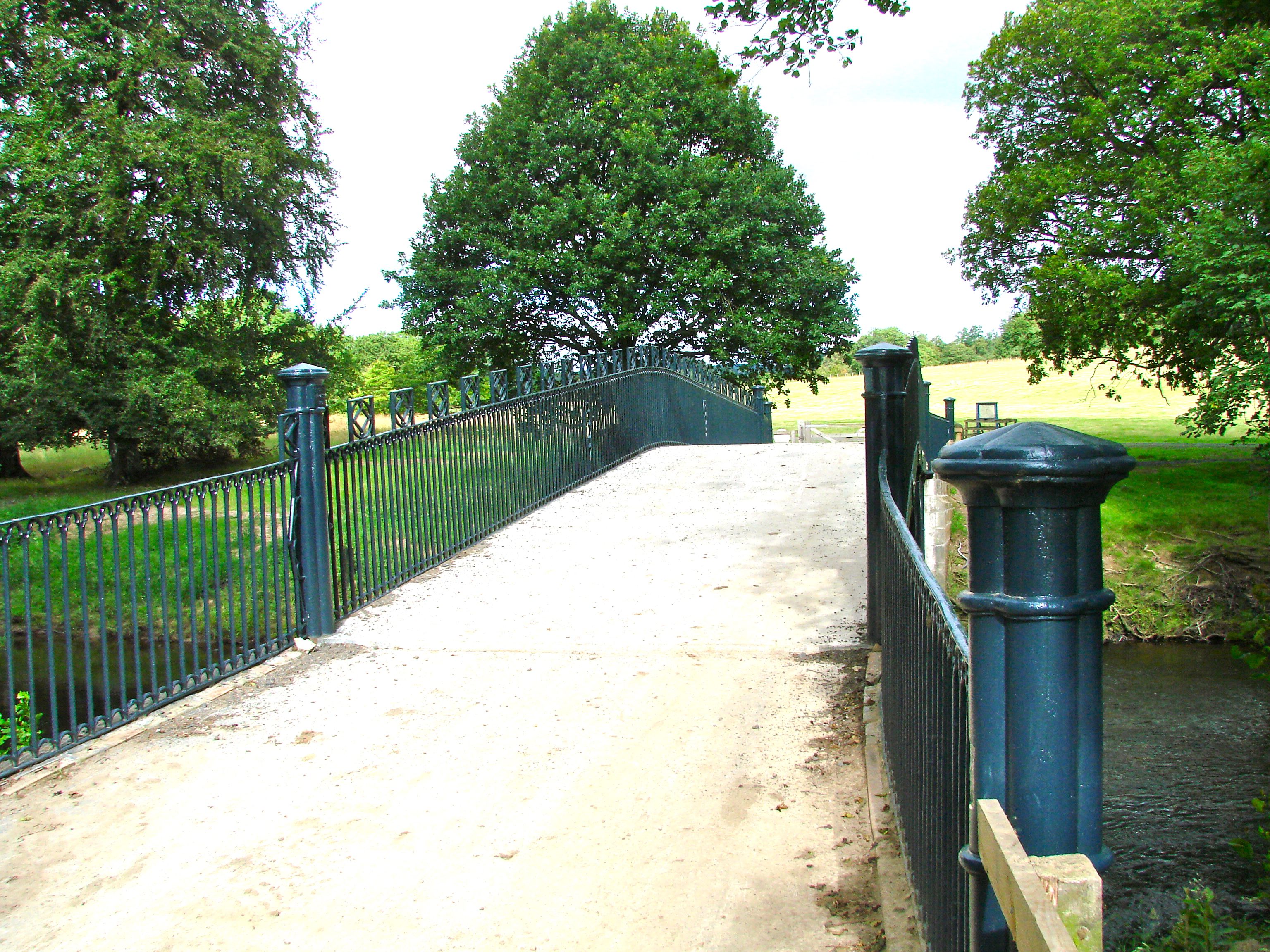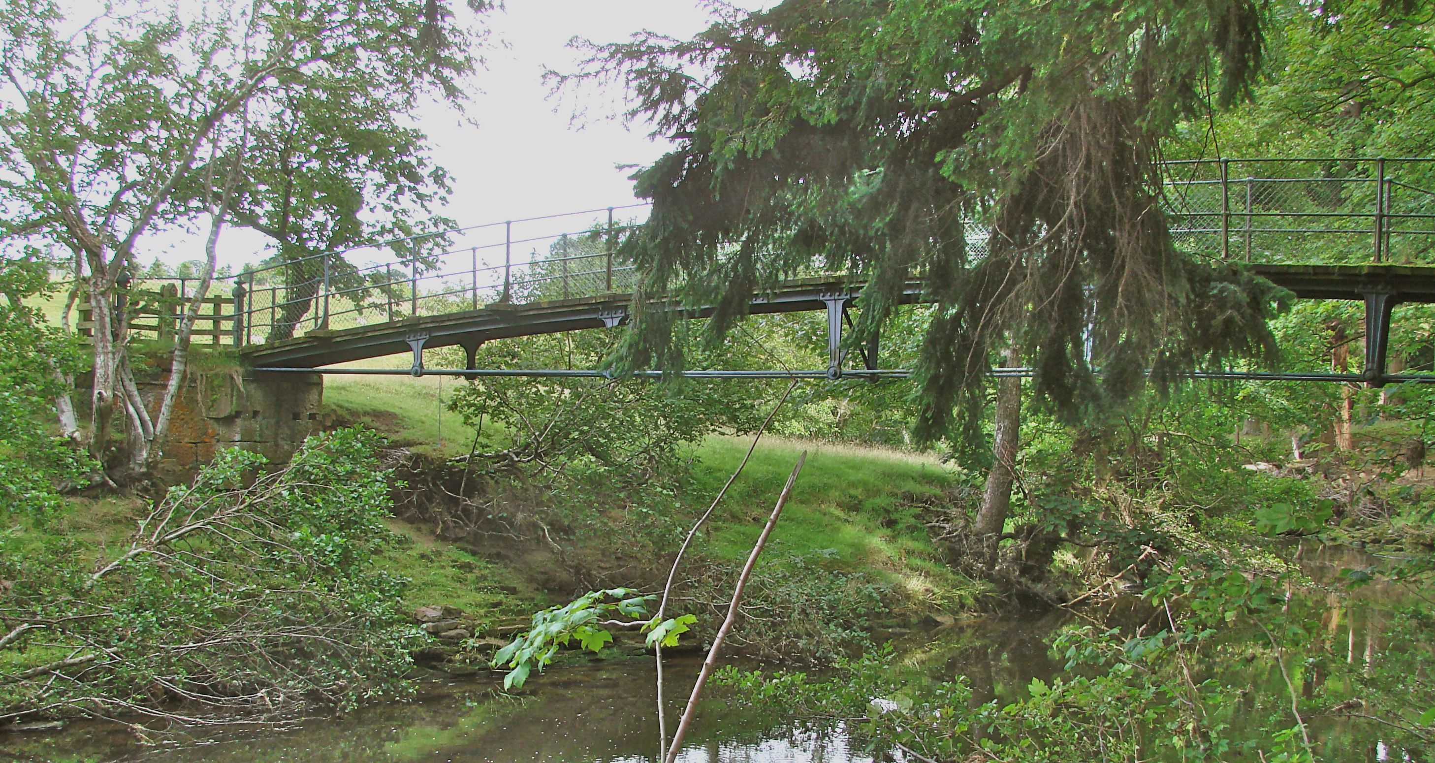 PRIVATE LAND At the Duke of Northumberland's estate Hulne Park in Alnwick, there are three iron bridges over the River Witham which winds through the large property. The earliest is known as The Iron Bridge (N55o 25’ 50.1” W1o 44’ 39”). It was designed by David Stephenson and built in 1812. It has recently been completely rebuilt and restored after severe damage by floods. This is a three span bridge whose arches are very similar to those of the iron bridge at the Duke's Syon Park estate near London which was designed by James Wyatt and built in 1790. They are formed by loops and circles of wrought iron. The parapets and post are more in the style of other bridges of the early 1800s. There is an iron inscription saying L&T Cookson, Newcastle 1812. This bridge is about 12 feet wide and perhaps 60 feet in length. It is used regularly to carry vehicular farm traffic.