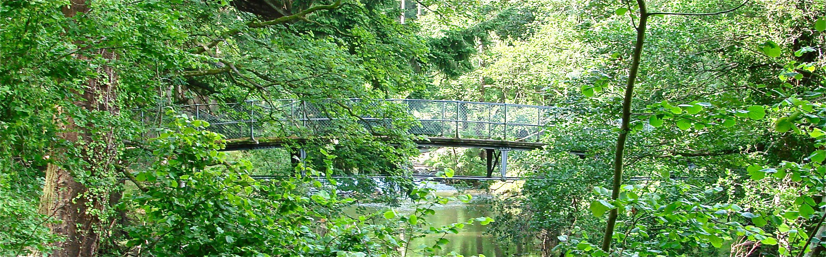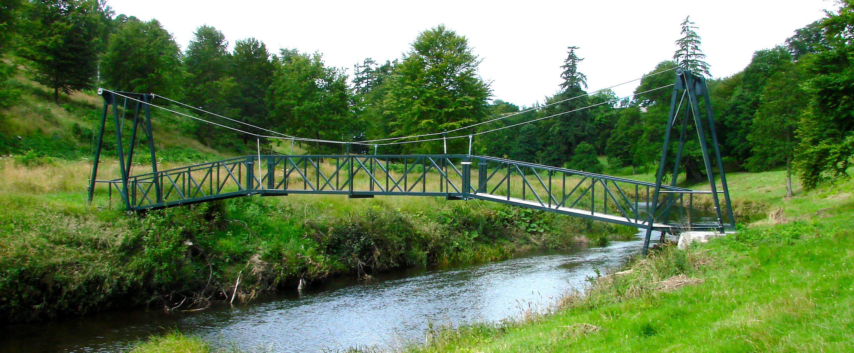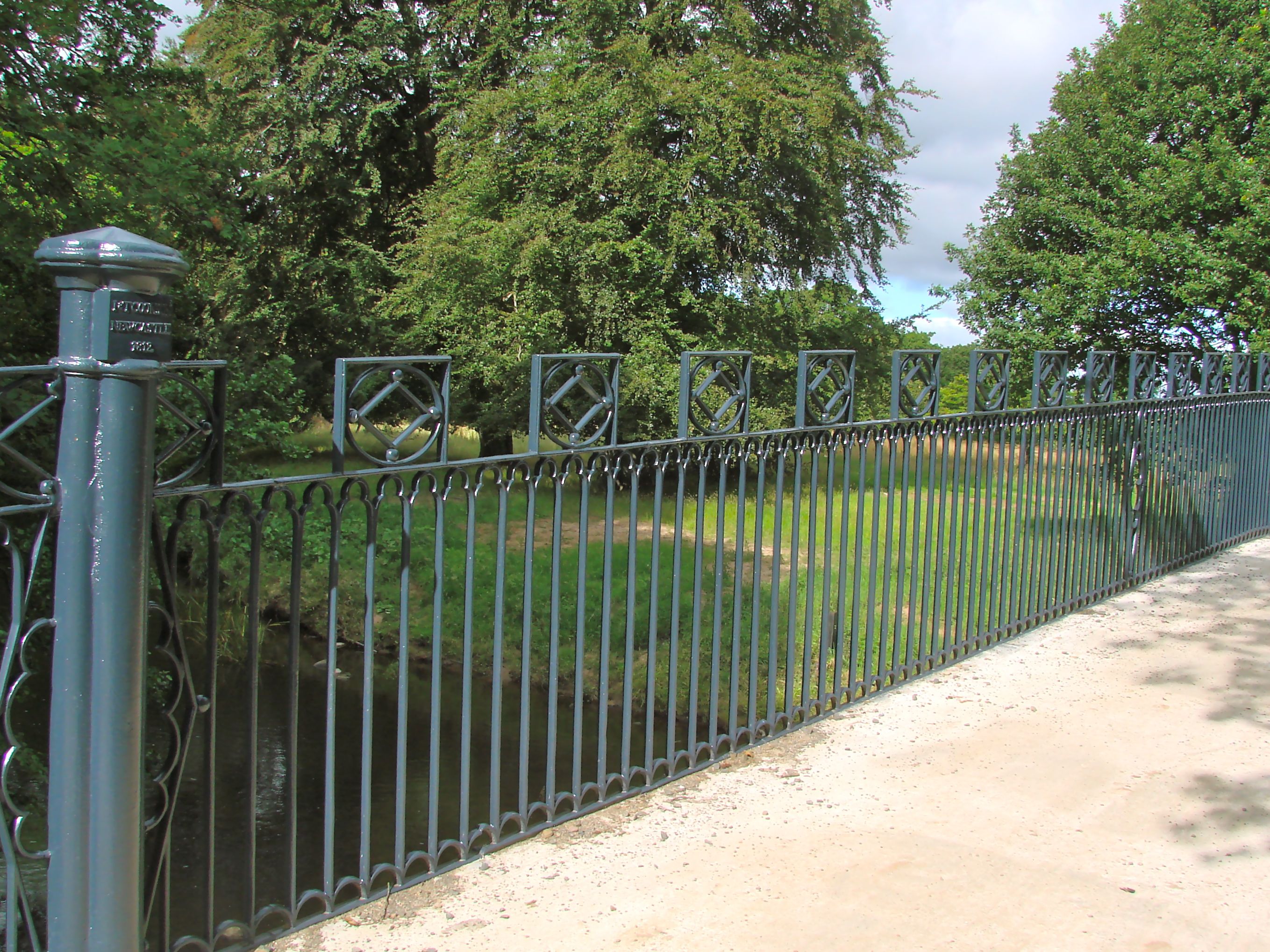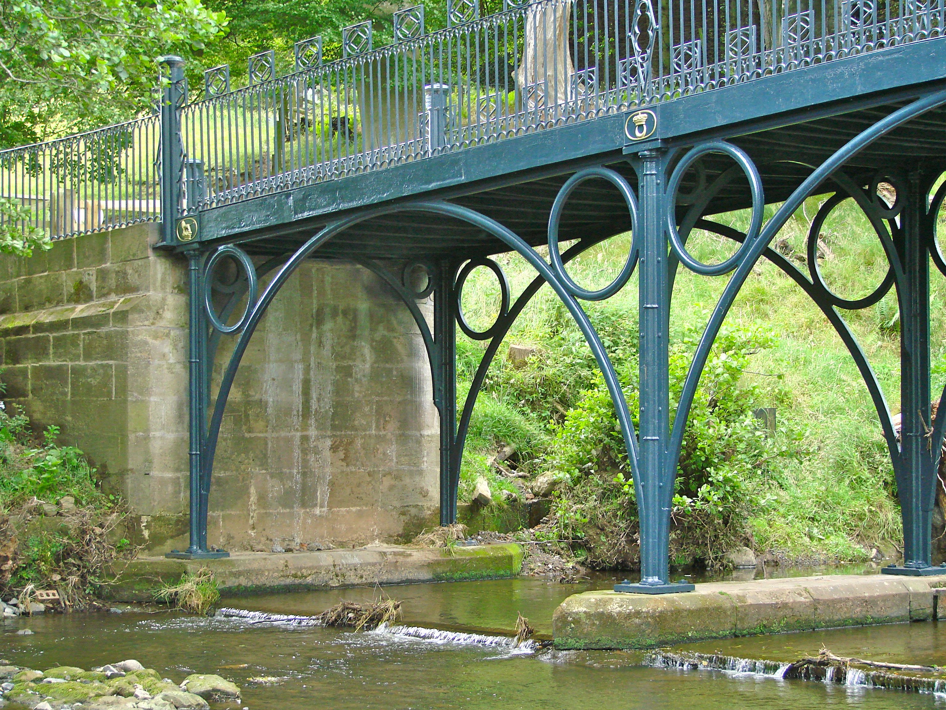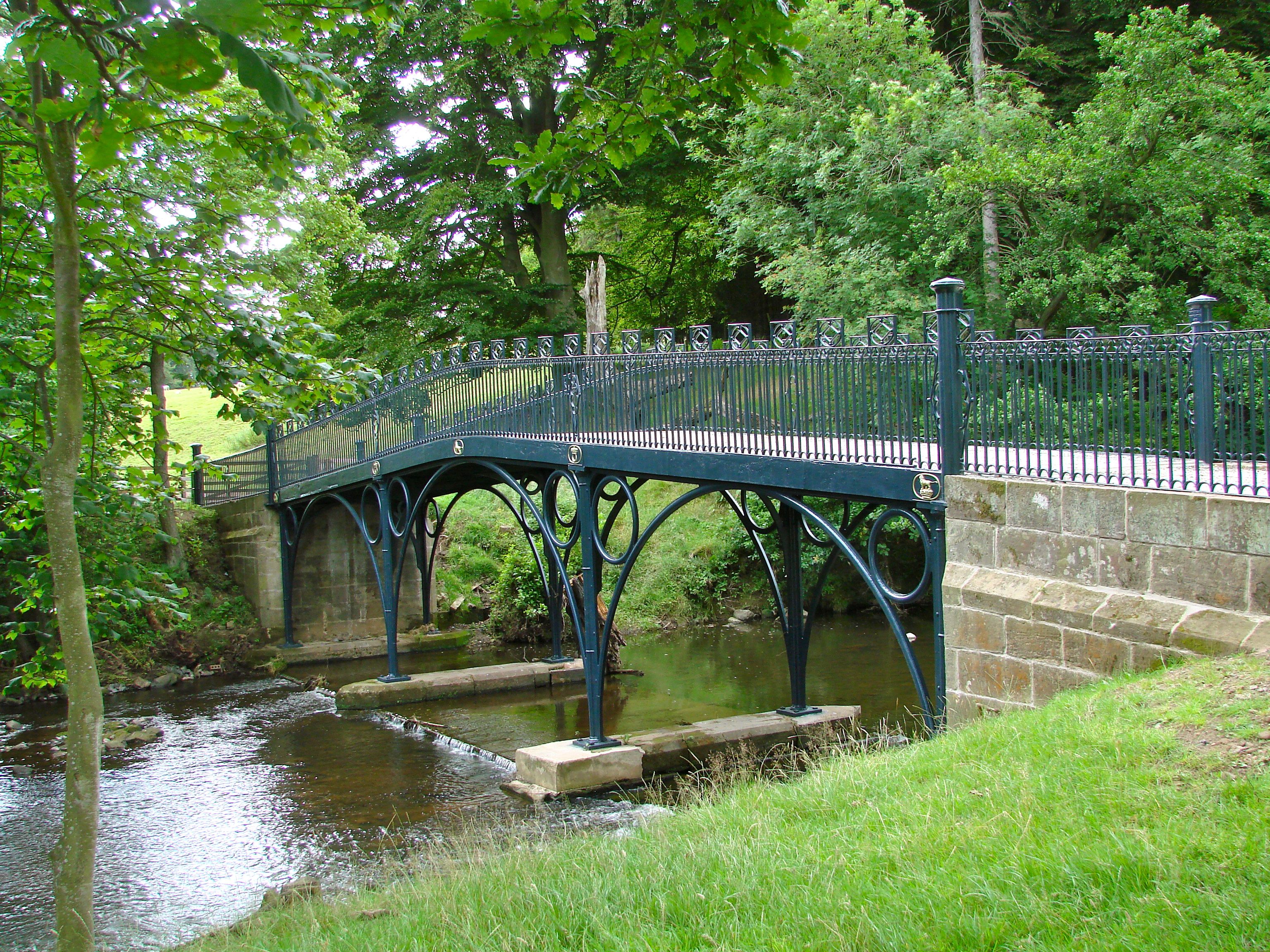 PRIVATE LAND At the Duke of Northumberland's estate Hulne Park in Alnwick, there are three iron bridges over the River Witham which winds through the large property. The earliest is known as The Iron Bridge (N55o 25’ 50.1” W1o 44’ 39”). It was designed by David Stephenson and built in 1812. It has recently been completely rebuilt and restored after severe damage by floods. This is a three span bridge whose arches are very similar to those of the iron bridge at the Duke's Syon Park estate near London which was designed by James Wyatt and built in 1790. They are formed by loops and circles of wrought iron. The parapets and post are more in the style of other bridges of the early 1800s. There is an iron inscription saying L&T Cookson, Newcastle 1812. This bridge is about 12 feet wide and perhaps 60 feet in length. It is used regularly to carry vehicular farm traffic.