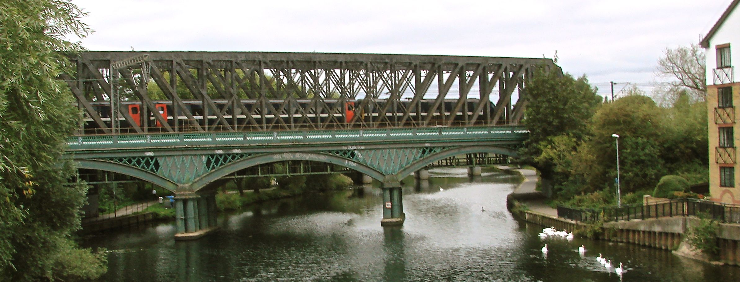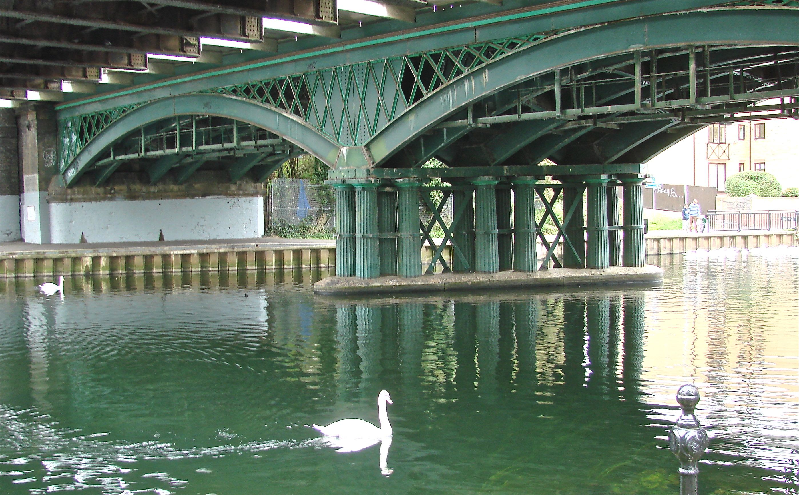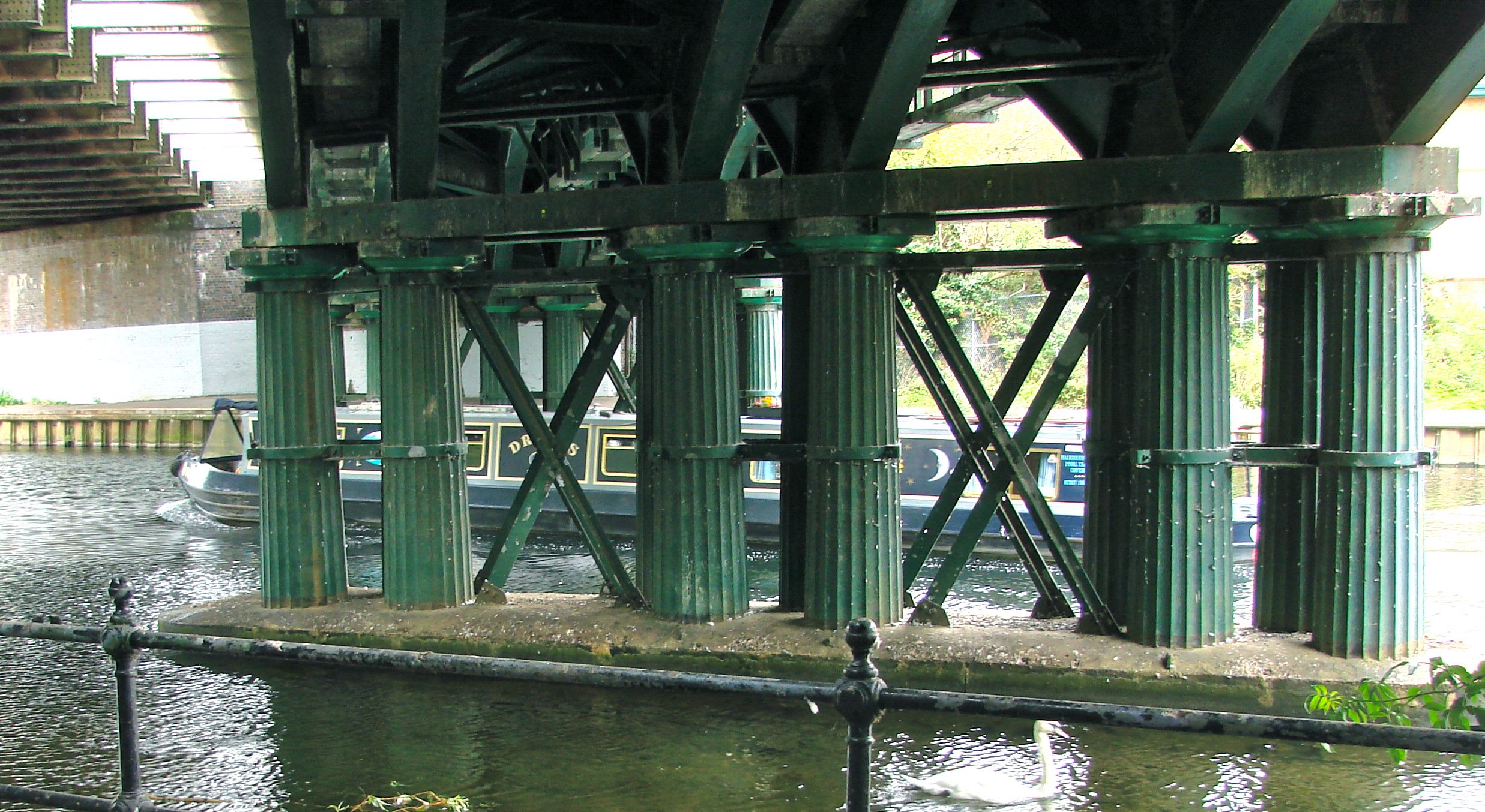 This handsome bridge was built by Thomas Brassey (1805-70) for the Great Northern Railway. It has three semi-elliptical cast iron arches each one resting on a pair of cast iron fluted Doric columns and carries the Great Northern Railroad across the River Nene. Each arch spans 66 feet with six ribs set in pairs. The arches are framed in solid arched girders, but the spandrels have a diamond lattice design. The concept of greek columns supporting the arches of a bridge can be seen in the Macclesfield Bridge 1815 on the Regent's Canal, London which Mr. Brassey may have seen.