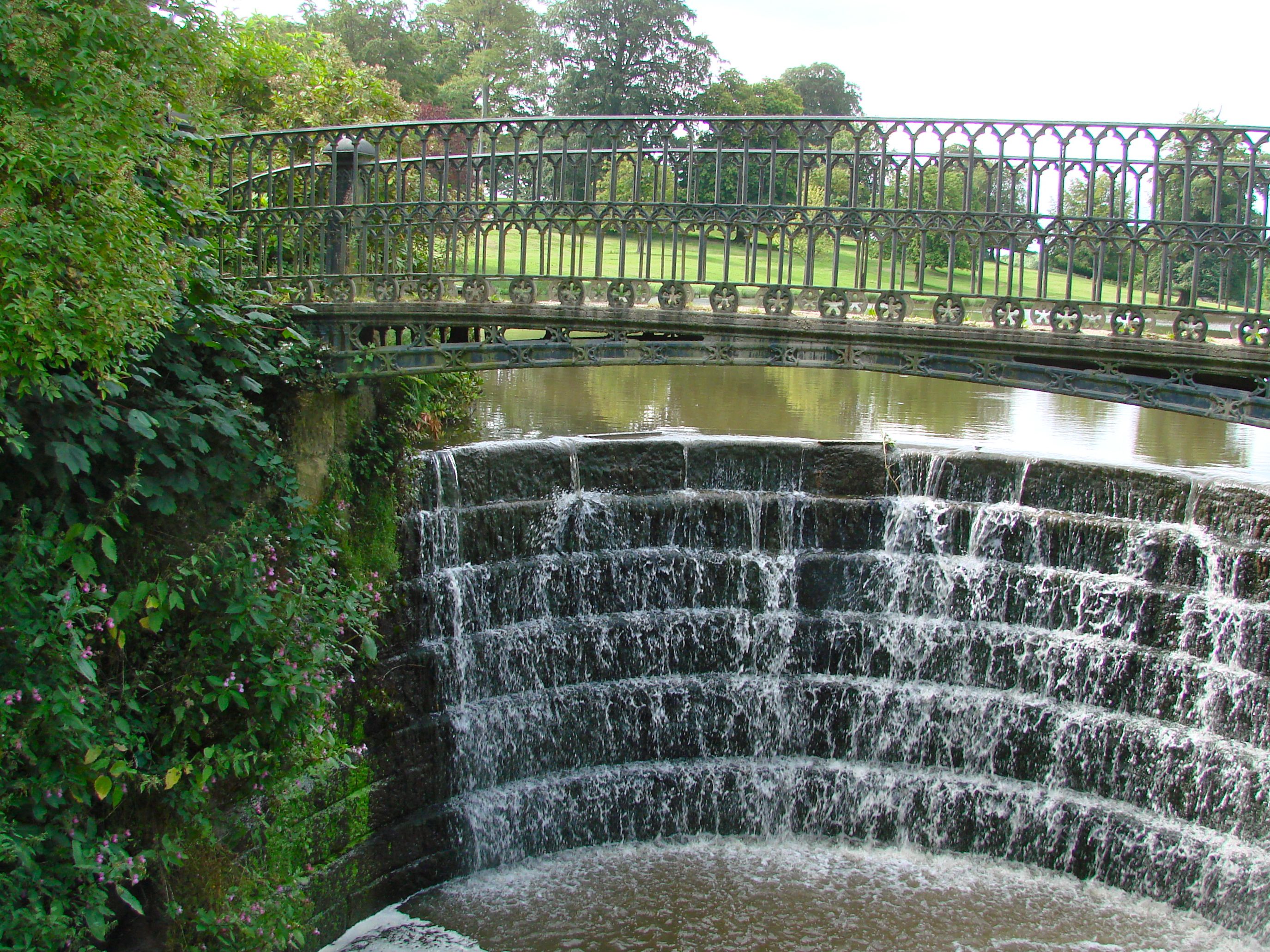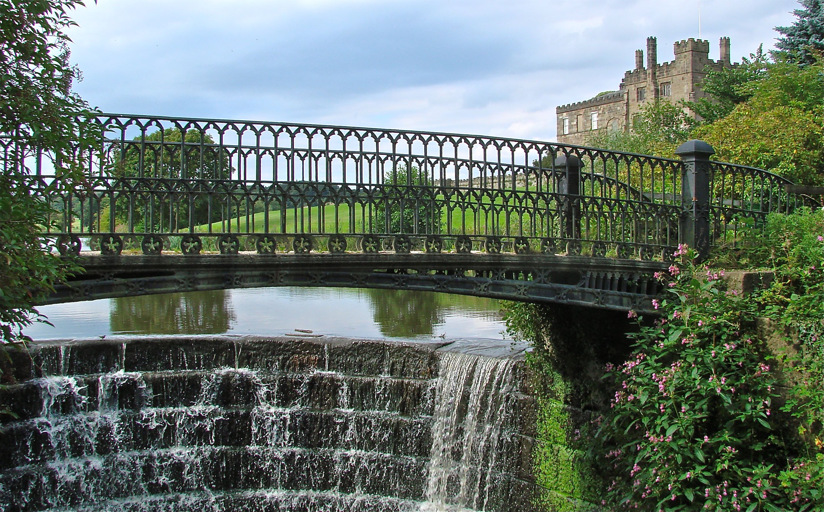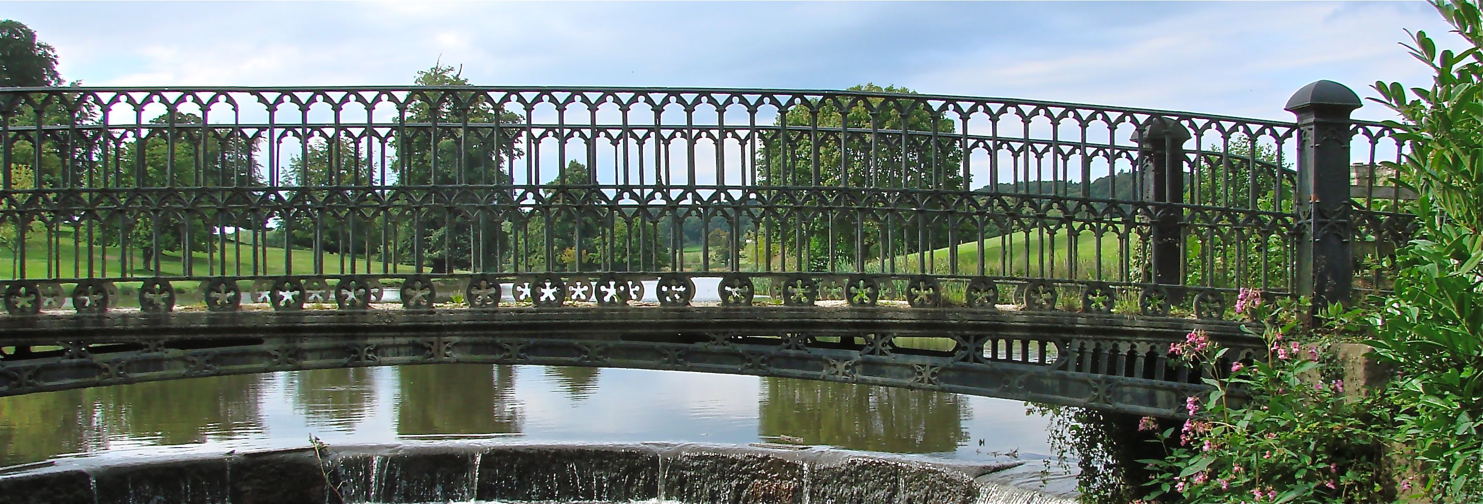 This perfect Regency town near Harrogate has a castle with a charming cast iron bridge in its garden. Although it is on private property, one has an excellent view of it over a low wall along the town foot path past the castle entrance. The span must be about 30 feet carried on two very shallow ribs. The width would appear to be about three feet. I would date it about 1830 or 40.