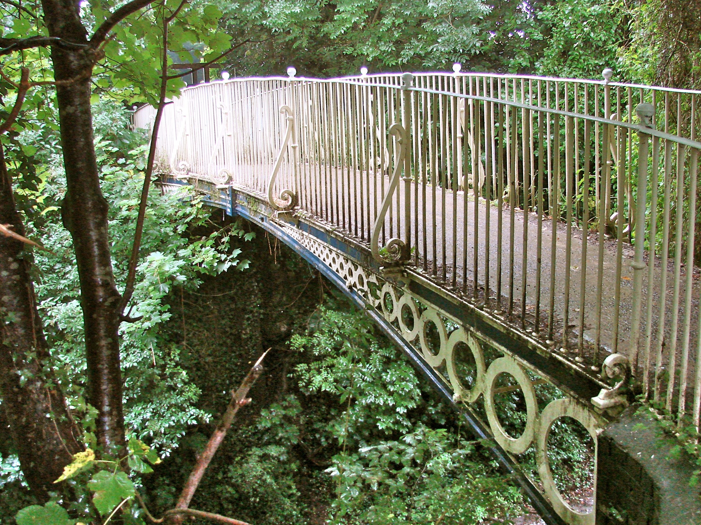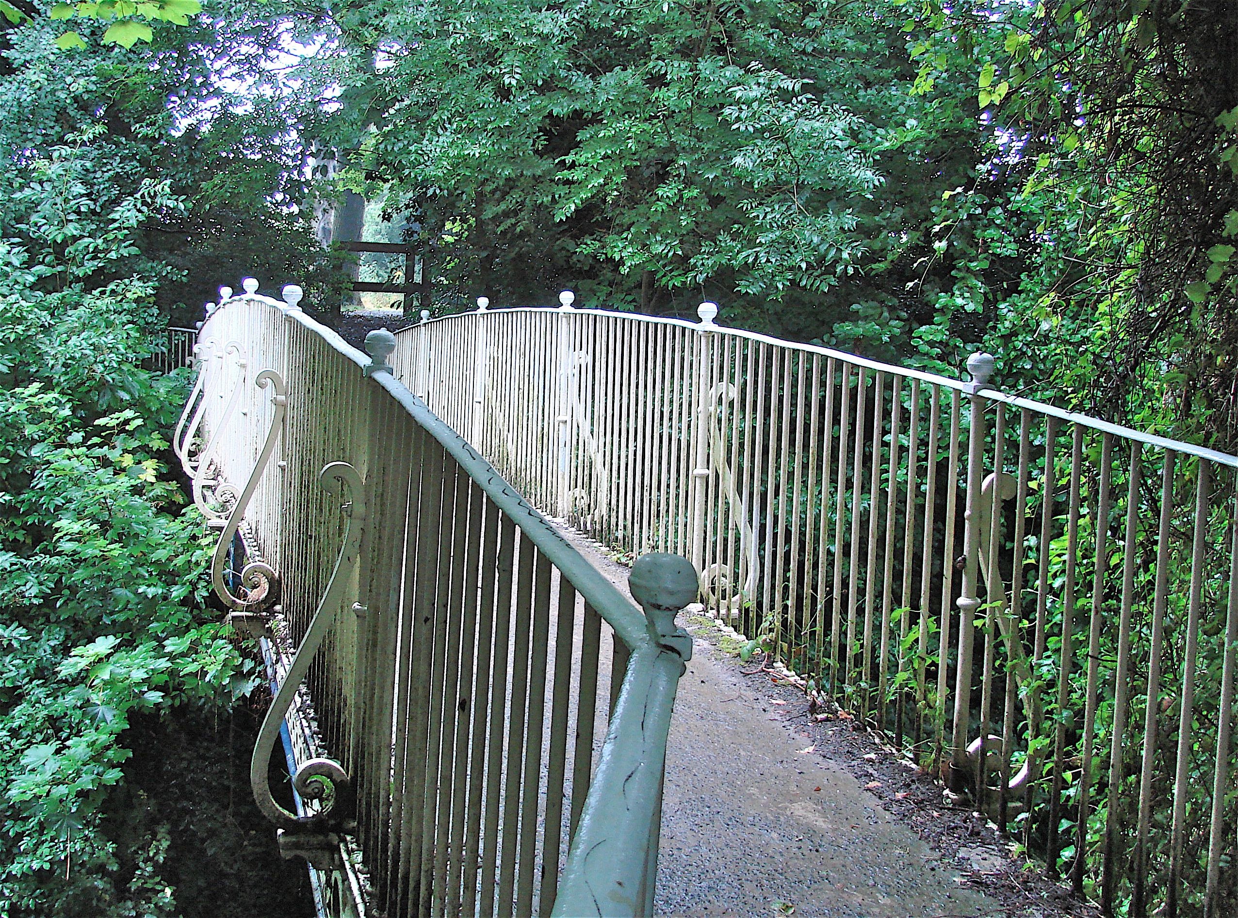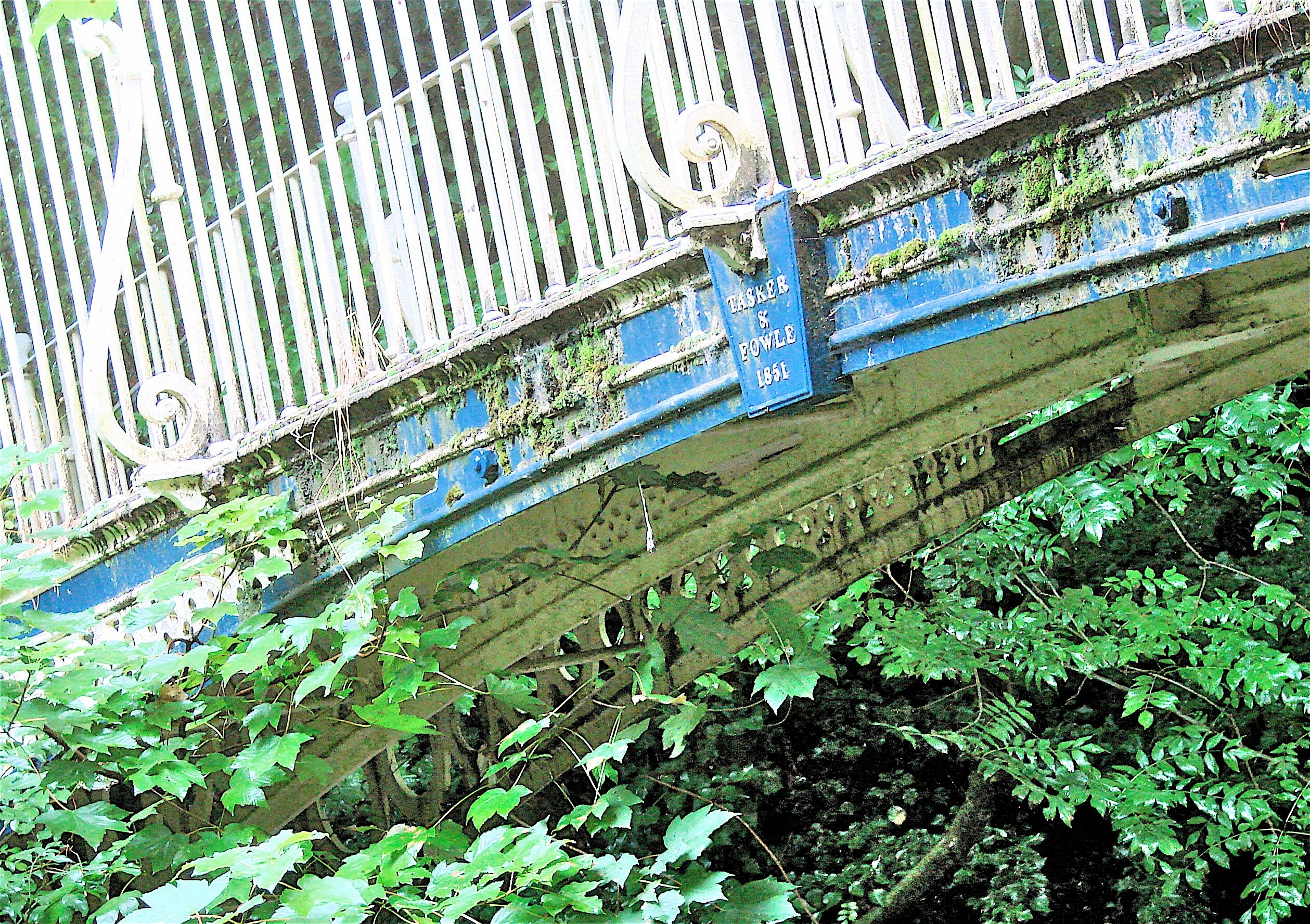 This elegant bridge was made by the foundry of Tasker and Fowle at Andover. It is a smaller twin of the Upper Clatford Bridge in Andover by the same firm. This bridge, a little over five feet in width, carries an unpaved carriage way or drovers lane across the now disused old London Road which lies in a deep cutting below it, both ways being surrounded by ancient trees in a forest setting.