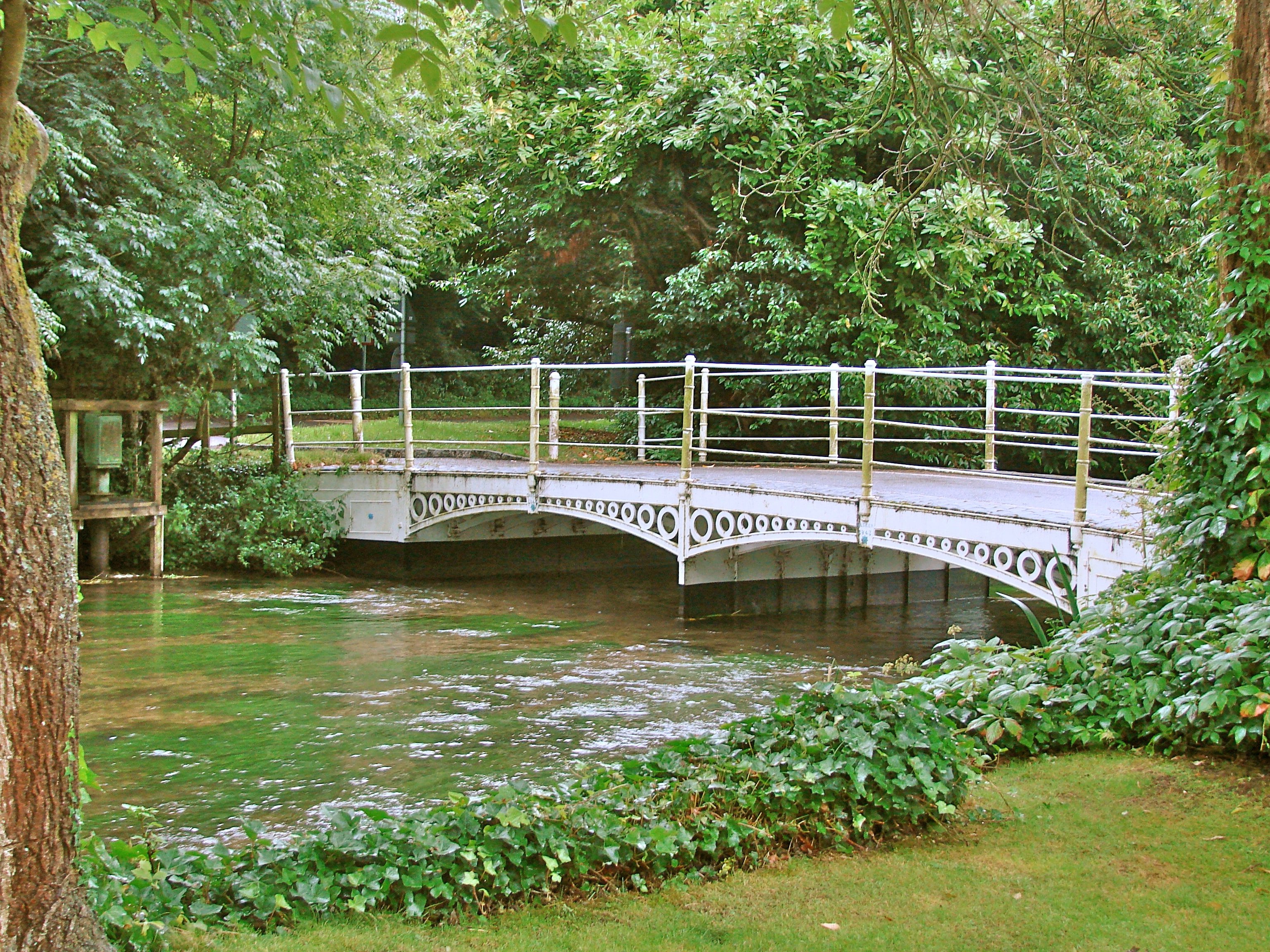 A two-span bridge in cast iron from the foundry of Tasker and Fowle at Andover. It crosses the River Anton. All components are of cast iron, including the river pier, wing wall, and abutments. They all slot together without bolts. Only ten patterns were required. It is possible the firm hoped to mass produce such bridges. The river pier is a cast-iron plate 5/8” thick on edge but stiffened at two foot centers with 2 inch thick ribs. This bridge is a twin of the Ladies Walk Bridge in Andover by the same firm, but the twin is a footbridge a little over 5 feet wide while this model is twelve feet wide.