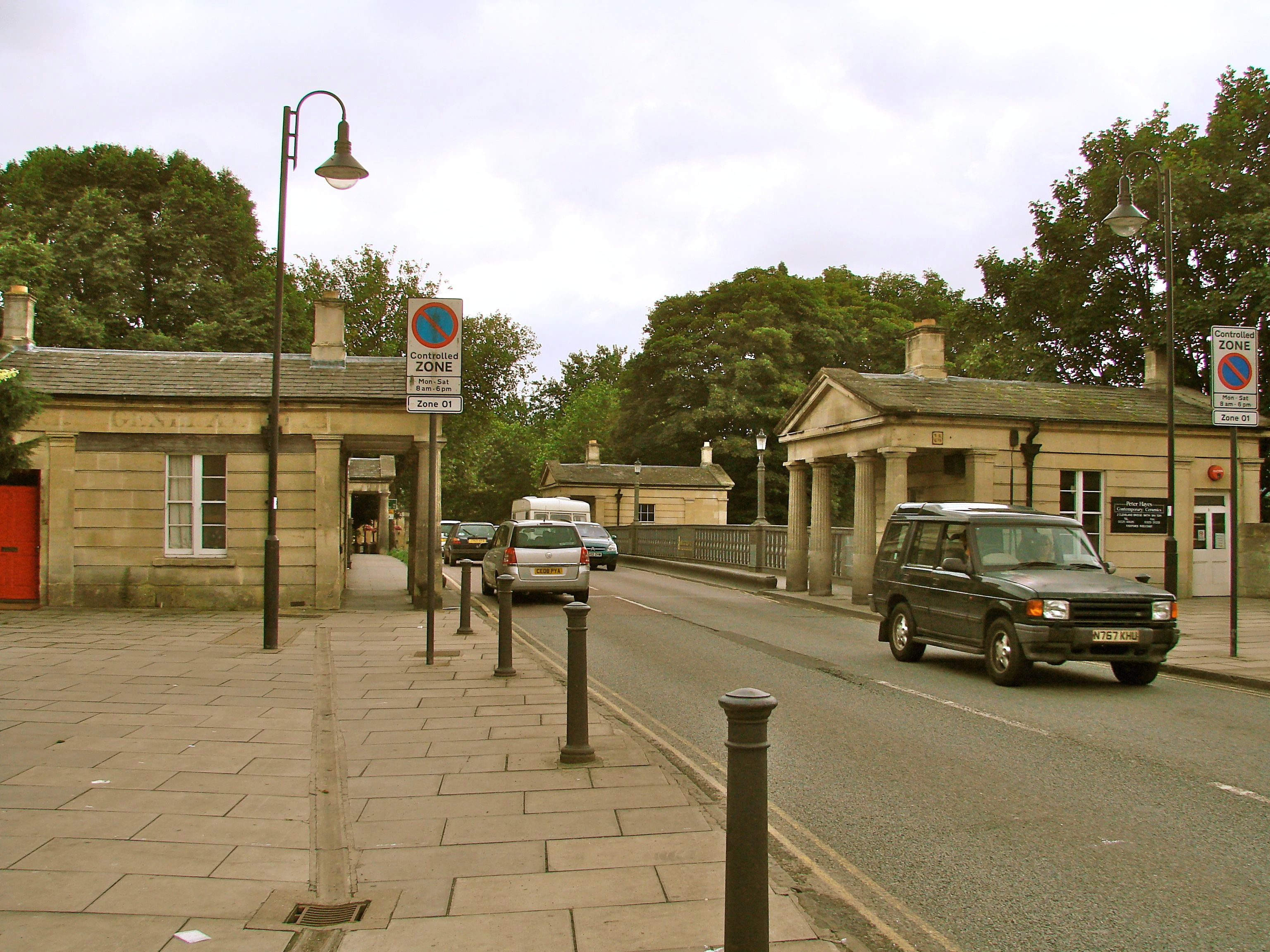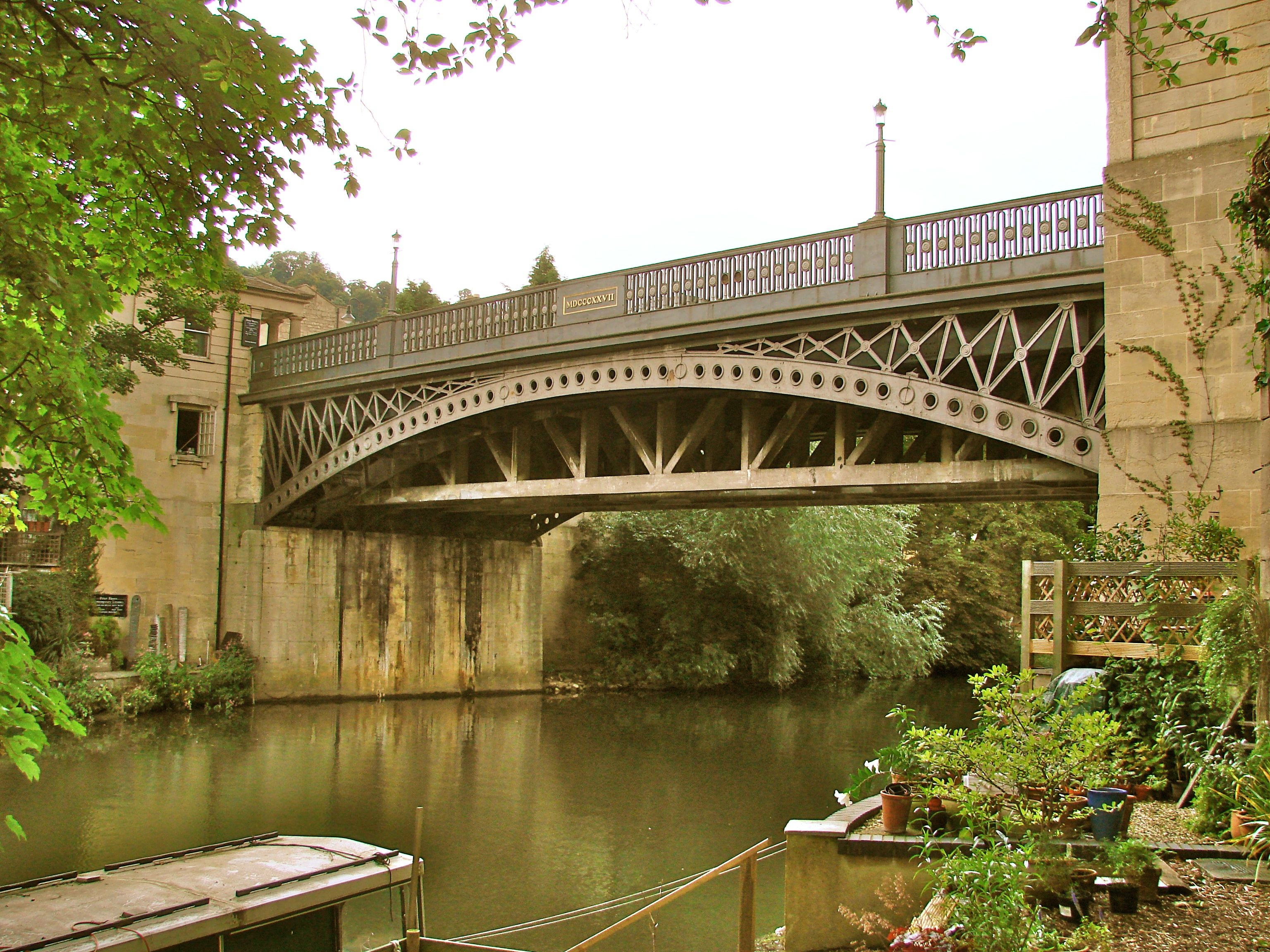 This arched cast iron bridge - designed by Henry Goodridge and built by William Hazledine of the Coalbrookdale Iron Works - crosses the Avon River at Cleveland Place in the heart of Bath. Small Georgian pavilions mark the four corners of the bridge – one of which was the toll house - echoing those around Cleveland Place. An Its incorporation and construction by the Bathwick Bridge Company was authorized by Act of Parliament. Unfortunately, the founding directors set the toll in perpetuity at one pence and by 1925, the City Council had to take over the bridge from the bankrupt company. In 1928-9 the bridge was re-enforced considerably to accommodate the weight of modern traffic.